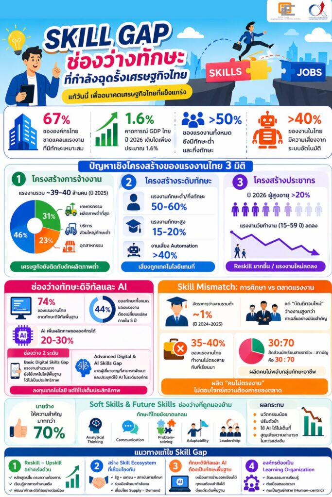 Skill Gap: ช่องว่างทักษะที่กำลังฉุดรั้งเศรษฐกิจไทย March 27, 2026April 27, 2026Productivity Knowledge, Productivity Outlook Facebook iconFacebookTwitter iconTwitterLINE iconLine